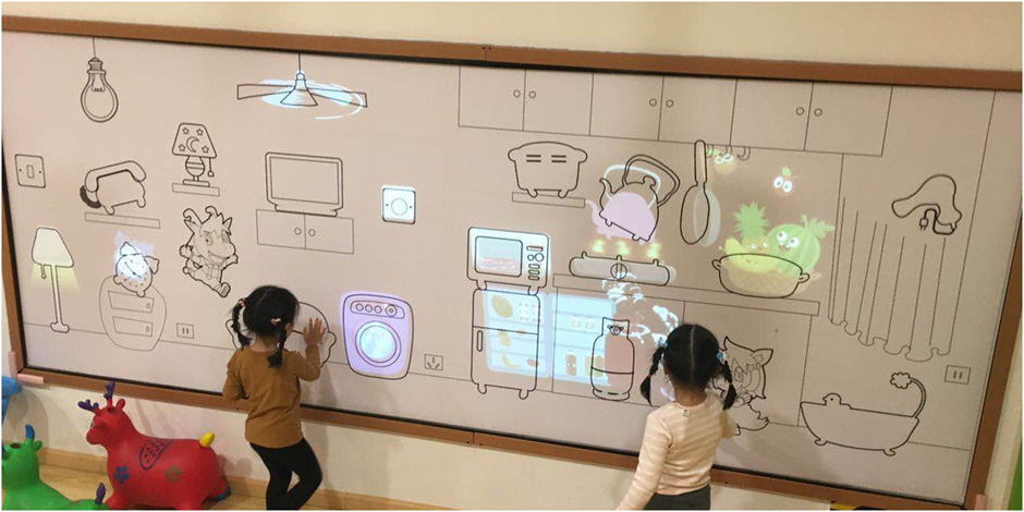 《神奇魔法墻》,實景造型與多媒體內容相結合,來和體驗者互動。魔法墻內置不同的內容主題,有海洋、森林、宇宙、生物等,這些知識貫穿在體驗者的互動體驗過程中。通過肢體觸碰,靜態造型墻會呈現逼真的動態效果。魔法墻采用墻面觸摸和交互技術,體驗者手指觸摸墻面上的影像,有聲音和影像閃動,不觸摸時候就會消失,賦予體驗者的雙手不同尋常的魔力。