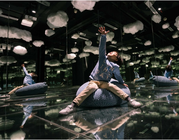《七彩光球》,色彩繽紛的星云填充了這個云霧繚繞的仙境,在《天氣實驗室》中,用聲音監測未來云朵的顏色變化,體驗者可以親自控制“天氣”的變化。只需對著天空呼喊,星云就會持續變幻顏色,當聲音達到一定分貝值時,會出現雷電交加的酷炫畫面,感受呼風喚雨,風起云涌的浪漫科技。