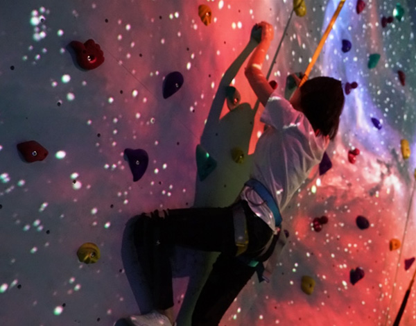 《太空漫步》利用人和裝置的互動,形象地科普宇宙物理概念—“能量磁場”。體驗者在宇宙中攀爬探索,墻體互動粒子會跟蹤體驗者的運動軌跡,當到達不同的高度,會有不同的互動回應,寓意著宇宙空間不同的位置具有不同的能量。