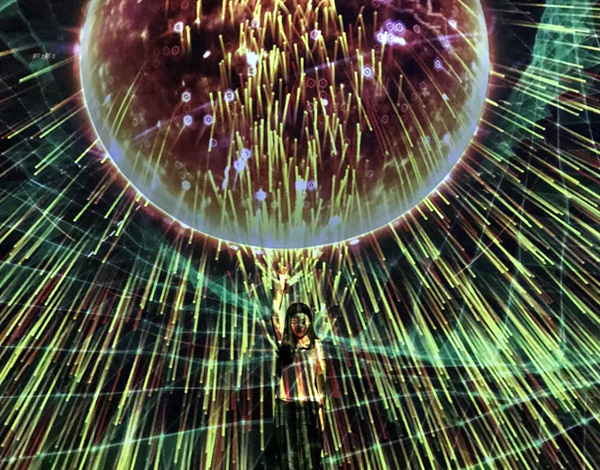 《太陽粒子》展現的是太陽粒子的能量運動。太陽是太陽系中心的恒星,是等離子體與磁場交織的一個理想球體,太陽采用核聚變的方式向太空釋放光和熱。體驗者可以伸手觸摸,和太陽粒子發生交互反應,產生微能量場。該項目意在借助數字媒體動畫表現手法,向體驗者科普太陽和太陽粒子的能量反應和能量聚合。